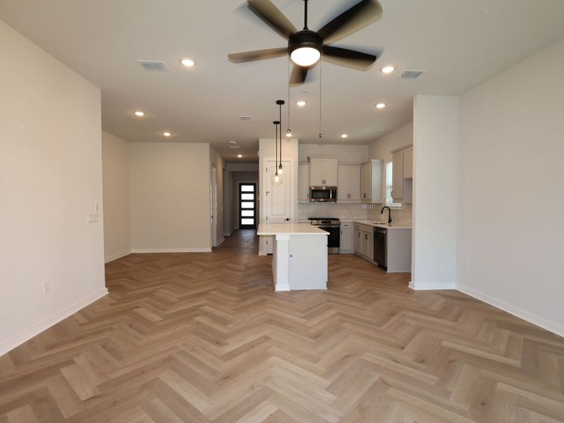 • Open-concept floorplan connecting kitchen, dining, and living areas