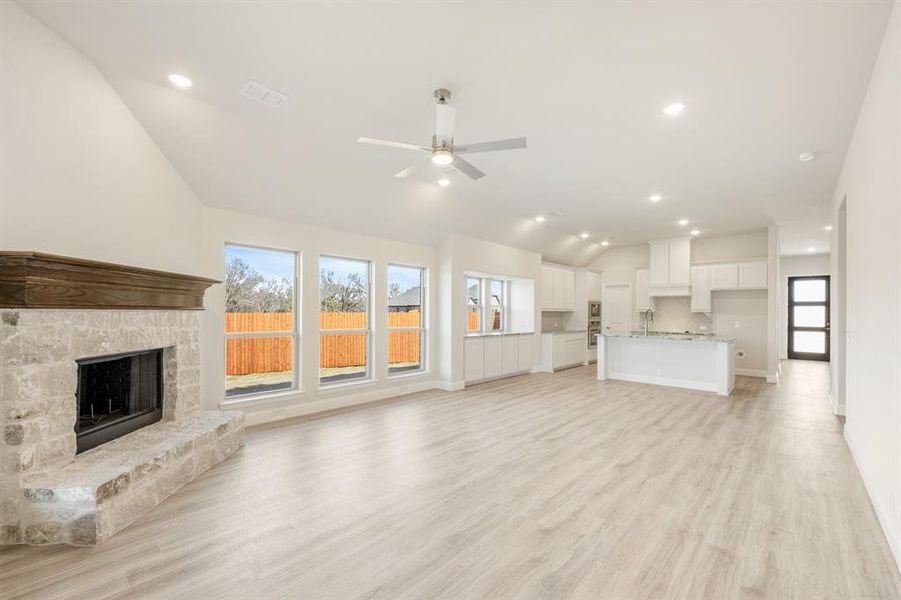 NEW! NEVER LIVED IN. Available to Move-In NOW! Bloomfield’s Cypress II is a versatile two-story plan offering 4 bedrooms, 3 full baths, and flexible spaces designed for modern living. From the curb, the brick-and-stone exterior with arched entry and professional landscaping delivers timeless appeal, while an oversized lot provides extra outdoor space for privacy, play, or entertaining. Inside, the Family Room is anchored by a wood-burning fireplace and tall windows that fill the space with light, flowing seamlessly into the Breakfast Nook and Kitchen. The Kitchen is appointed with Granite countertops, stainless steel appliances, custom cabinetry, and a walk-in pantry, plus a buffet in the dining area for extra storage and serving space. A private Study with dual doors sits off the entry, while the large Primary Suite on the first floor includes a dedicated sitting area, spa-like bath with dual sinks, soaking tub, separate shower, and a huge walk-in closet with built-in shelving. 2 secondary bedrooms downstairs each have walk-in closets and share a full bath, while the laundry room, linen closet, and under-stair storage add functionality. Upstairs, a spacious Game Room serves as a second living area and is joined by another bedroom and full bath, creating a private retreat for guests or family. Throughout the home, Laminate Wood flooring in main areas pairs with neutral finishes for lasting style and easy upkeep. Outdoors, enjoy a covered back patio for cookouts, a fenced yard with fresh sod, stone-edged flower beds, and a sprinkler system that keeps landscaping vibrant year-round. Call or visit today to learn more!