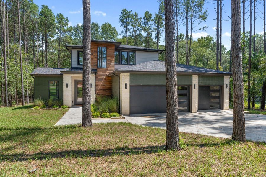 Modern Luxury Home on 1 Acre in Four Corners Subdivision. Nestled on a beautiful 1-acre wooded lot in the desirable Four Corners Subdivision, this custom-built 2,335 sq. ft. home combines modern design with natural surroundings. The exterior features a striking mix of stone, wood, and sleek black finishes that create an inviting contemporary look. Inside, you'll find a spacious open floor plan with 1,576 sq. ft. on the main level and an additional 700 sq. ft. upstairs, offering plenty of room for comfortable living. The home includes a large garage (over 700 sq. ft.) and welcoming outdoor spaces, including a front porch and back patio ideal for entertaining. Highlights include: 3 bedrooms / 2.5 baths, Water well with sprinkler system for easy lawn maintenance, A tranquil creek running through the backyard, Soaring ceilings, expansive windows, and modern finishes throughout, Peaceful wooded setting with both privacy and convenience Located just minutes from Livingston.