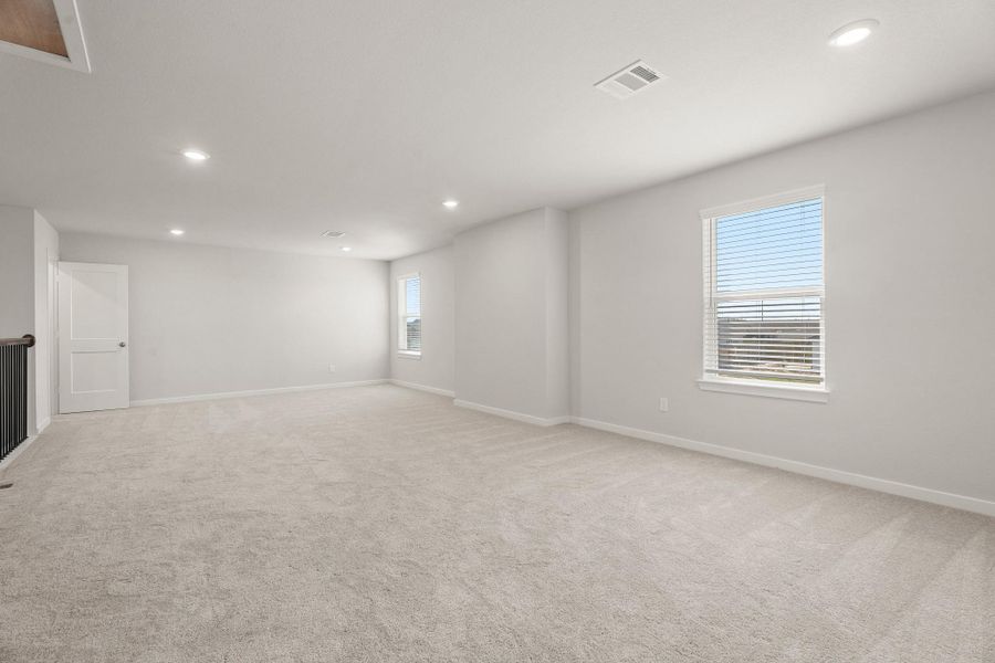 With over 3,000 square feet, the Sinclair boasts abundant space for private living and entertaining. This plan welcomes you with a charming columned front porch, leading you into a welcoming foyer. Directly off the foyer, a secluded study boasts a walk-in closet. Beyond the foyer, you'll love an open-concept living area that features an inviting kitchen—boasting a center island and corner pantry—an elegant dining area and a spacious great room. Anchoring the home, a convenient downstairs primary suite features its own attached bath and an expansive walk-in closet. Additional main-floor highlights include a valet entry off the 2-bay garage and a patio off the dining area. On the second floor, three secondary bedrooms—each with a walk-in closet—surround a versatile loft space.