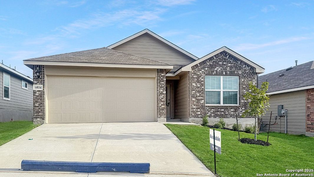 Introducing The Torre, a one-story home featured in our Stonehill community in San Antonio, TX. This floor plan offers 3 classic exteriors, 2-car garage, and a full yard landscaping and irrigation package, ensuring that your home looks its best every single day. Inside this 3 bedroom, 2 bathroom home, you'll find 1442 square feet of open-concept living. A front foyer leads you to a blended dining area, gourmet kitchen, and living room, perfect for entertaining and every day living. Your kitchen includes quartz countertops, stainless steel appliances, gas cooking range, stylish subway tile backsplash and abundant cabinet storage space. The private main bedroom is located off the living room towards the back of the home and includes a connected ensuite bathroom with dual vanity sink, a garden bathtub and a spacious tiled walk in shower. Enjoy additional privacy with a separate door for the toilet and a walk-in closet with built in shelving. Your secondary bedrooms are located at the front of the home right off the foyer and all feature quality carpet flooring and a closet, and can be used as bedrooms, offices, workout spaces or other bonus rooms. The possibilities are endless with The Torre floor plan. Additional features include tall 9-foot ceilings, 2-inch faux wood blinds throughout the home, luxury vinyl plank flooring at entry, living room, kitchen, and dining area, ceramic tile in the bathrooms and utility room, and pre-plumb for water softener loop. You'll enjoy added security in your new home with our Home is Connected feature. Using one central hub that talks to all the devices in your home, you can control the lights, thermostat and locks, all from your cellular device. Relax outside on the covered patio (per plan) and enjoy full yard landscaping and full yard irrigation. This perfect starter home includes our HOME IS CONNECTED base package. Using one central hub that talks to all the devices in your home, you can control the lights, thermostat, locks and more all from your cellular device.