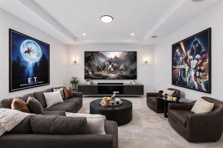 Designed for both leisure and functionality, this home offers two distinct living areas, including a oversize theater room to capture the immersive cinematic experience. The grand living room is defined by its soaring vaulted ceilings and an electric fireplace, creating a striking focal point. A chef's dream kitchen features pristine Corian countertops and an island with a striking waterfall edge, complemented by custom cabinetry and high-end appliances. The home is further enhanced by modern, unique light fixtures that illuminate the space with sophistication.