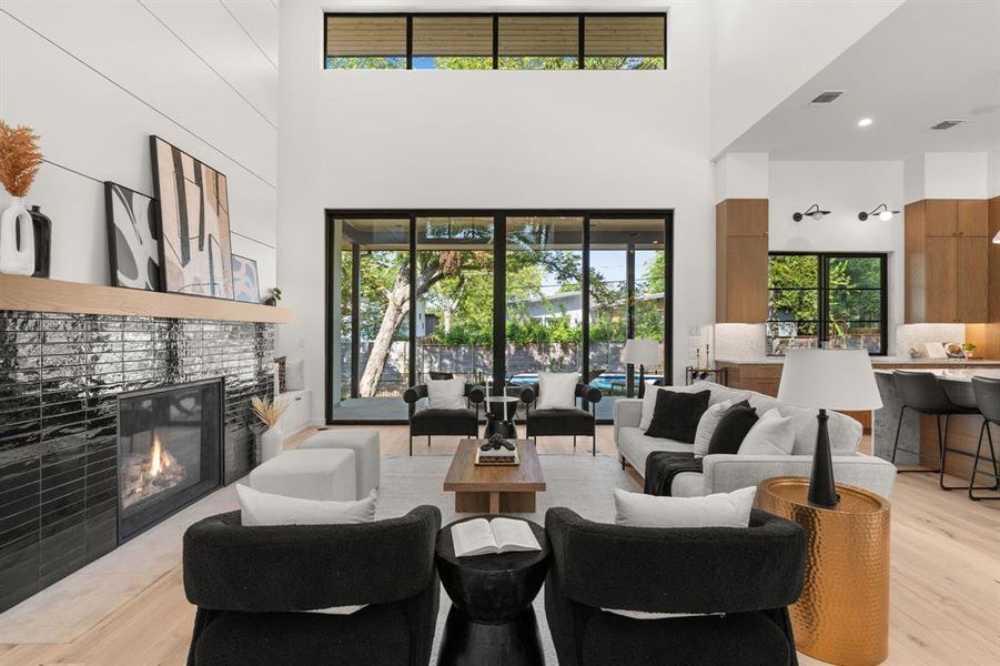 This new construction home is a masterpiece of modern design, offering 5 bedrooms and 5 full bathrooms across a thoughtfully designed layout. Step through the custom 10’ white oak front door into a dramatic main living space, where soaring 20+ foot ceilings and oversized Ram steel sliders set the stage for seamless indoor-outdoor living. Beyond the glass, a sparkling pool, expansive covered patio, built-in outdoor kitchen, and custom outdoor gas fire pit create the ultimate backyard retreat for entertaining or unwinding in style. The chef’s kitchen is a statement of elegance and performance, featuring striking marble countertops, a Wolf/Sub-Zero custom panel appliance package, and a spacious butler’s pantry complete with a second dishwasher. A custom dry bar built into the dining area adds sophistication to every gathering. The home’s five bedrooms are designed with flexibility in mind, including a convenient secondary bedroom on the main floor. Also on the main floor, the spa-like primary suite offers a true retreat with a soaking tub and calming finishes, including access to the covered patio. Throughout the home, thoughtful design abounds—from rich tones of green and blue woven into the interiors, to hidden storage under the stairs, to a custom entry drop zone that marries beauty with function. A three-car garage with an added storage room ensures space for every need, while details like the oversized front entry and curated finishes highlight the craftsmanship at every turn. This home blends bold design with livability—an unforgettable new build in one of Austin’s most desirable neighborhoods.