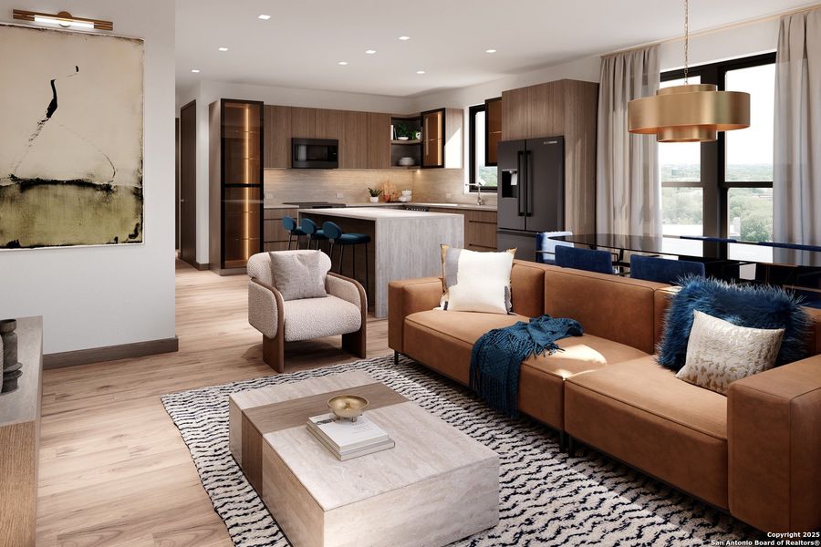 Welcome to The Milliner floorplan at The Ferguson, a new condominium community in the heart of Taylor, Texas. This 4th floor corner residence features soaring 11 ft ceilings and expansive windows that flood the space with natural light. The thoughtfully designed kitchen showcases Italian cabinetry with elegant glass front cabinet doors, sleek black Bosch appliances, including a 5-burner gas cooktop, convection microwave oven, and refrigerator with ice and water dispenser, along with a spacious pantry and pull-out trash/recycle storage. Perfect for entertaining, the generous dining area comfortably accommodates 8-10 guests. The primary suite is privately situated and includes a walk-in closet and bathroom with dual vanities as well as grout-less, Skema tiles. A separate study provides an ideal space for work or reading, while a balcony off the living room offers a relaxing outdoor space. Residents will also enjoy the convenience of first floor retail, including a planned restaurant. Located just minutes from downtown and only 8 minutes to the Samsung plant, The Ferguson blends small town charm with modern convenience in the growing community of Taylor. The most affordable, new condominiums in the Austin submarket. Enjoy a slower pace of life in small town living with an abundance of opportunities. Construction starting in late summer with delivery in 18-22 months. Reserve your space now and enjoy discounted pre-construction pricing.