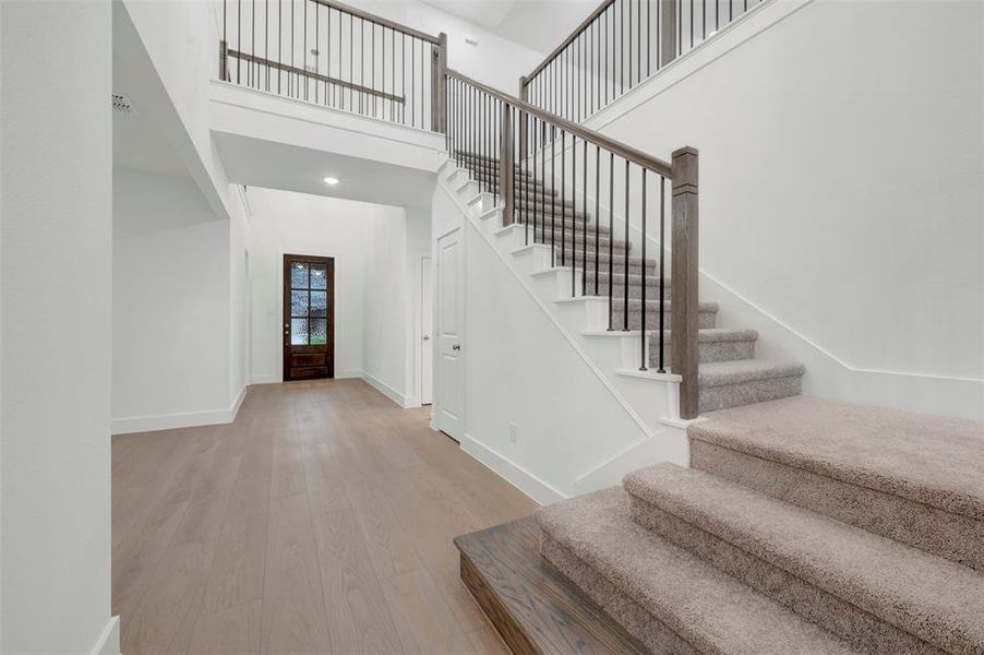 The owner's suite in its own private corner on the main floor is truly a sanctuary, featuring an en-suite bathroom with a dual-sink vanity and 2 walk-in closets. Another bedroom suite, a versatile flex room, and a covered patio can also be found on the first floor.