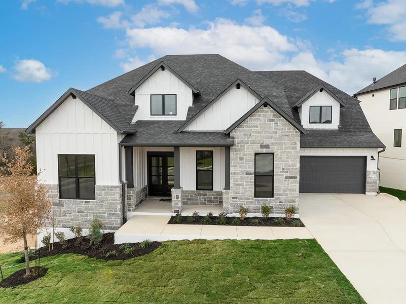 Discover this beautifully crafted home in the heart of Wolf Ranch West Bend, one of Georgetown’s premier communities. This thoughtfully designed floor plan is filled with natural light, open living spaces, and the flexibility today's families need. Step inside to find a spacious study, perfect for a home office or quiet retreat. Beyond the entry, a soaring two-story foyer opens to a formal dining room, flowing seamlessly into the expansive family room and gourmet kitchen. Enjoy casual meals at the large kitchen island or unwind outdoors on the covered rear porch, ideal for Texas evenings. The primary suite on the main floor is a true retreat, featuring tray ceilings, a spa-inspired bath, and premium finishes throughout. A first-floor guest suite adds convenience and privacy for visitors, while upstairs offers three additional bedrooms, a game room, and a media room, plenty of space for family fun and relaxation.