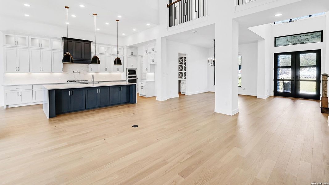 Grand two-story entry with 20-foot ceiling. Hardwood floors throughout living areas. Two-story home office with French doors, and circular staircase set at entry. Formal dining room with coffered ceiling. Island kitchen with built-in seating space, a 5-burner gas cooktop and two wall ovens opens to the morning area with wall of windows. Spacious family room with 20-foot ceiling, wood mantel fireplace and a sliding glass door. Media room and opposite game room with wall of windows and convenient access to the backyard. Secluded primary suite with grand wall of windows. French door entry to the primary bath with dual vanities, a freestanding tub, separate glass enclosed shower, two walk-in closets with access to utility room and a linen closet. Private guest suite on both first and second levels. Secondary bedrooms with walk-in closets and Hollywood bath complete the second floor. Extended covered backyard patio. Three-car garage.