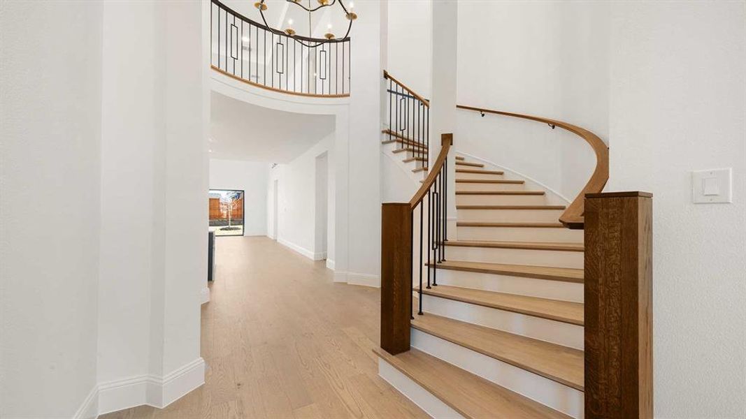 Welcome to this exceptional home, where the front porch opens into a grand entryway with soaring 19-foot ceilings. French doors lead to a private home office, while a guest suite with a walk-in closet, ample storage and full bath provides comfort and convenience. Beyond the striking spiral staircase lies the heart of the home—the kitchen with a large island, built-in seating, and a generous walk-in pantry. The adjoining dining area is filled with natural light and flows seamlessly into the family room, highlighted by a fireplace and sliding glass doors that open to the covered patio. The primary suite is a luxurious, private retreat with a wall of windows where French-door lead to the bathroom featuring dual vanities, a freestanding tub, a glass-enclosed shower, and two walk-in closets. Upstairs, a spacious game room with a wall of windows connects to a dedicated media room, while secondary bedrooms each include ample storage and private baths. A utility room and mudroom are thoughtfully placed off the three-car garage, completing this impressive design.