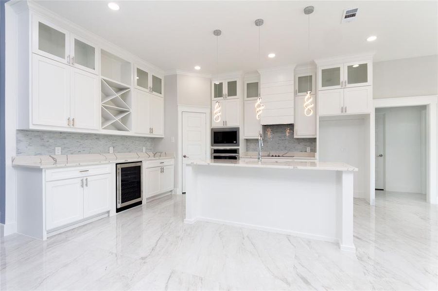 - Wine RefrigeratorDishwasherMicrowave OvenDisposalElectric CooktopGranite countertopKitchen IslandElectric Oven