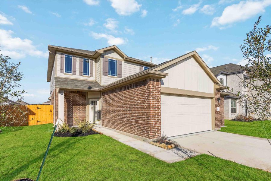 The Mansfield floorplan, designed with 2,416 square feet of thoughtfully designed living space highlighted by soaring 20-foot ceilings in the open family room. This 6-bedroom home includes two bedrooms downstairs, featuring a private owner's suite with a luxury bath offering a separate tib and shower, plus a walk-in closet. A second bedroom on the first floor sits conveniently near a full bath across the hall - perfect for guests or multi-generational living. Upstairs, a versatile gameroom with contemporary iron railing overlooks the living area, creating an open and connected feel. The kitchen showcases granite countertops and flows seamlessly into family room for easy entertaining. Luxury vinyl plank and carpet flooring, an extended covered patio, front yard sprinkler system, and a spacious 2.5-car garage add comfort and convenience. Enjoy small-town charm with quick access to US-59/i-69 and nearby shopping and dining.