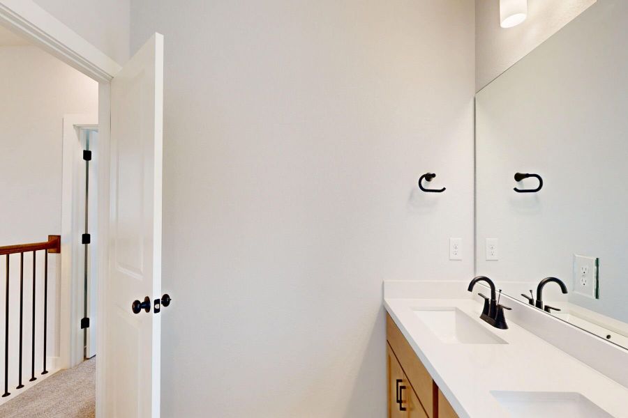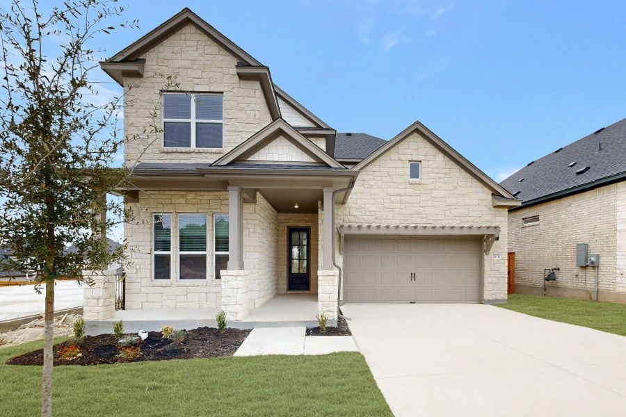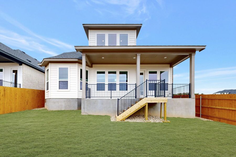 The Balcones features 20ft ceilings in the entry and living room. Modern open railing throughout. Living room has a 2 story wall of windows flooding the great room with natural light, downstairs is the master suite, study and guest suite, and upstairs we have 2 beds/1 full bath a huge gameroom. All stainelss steel appliances, modern wood look cabinets and gorgeous white quartz countertops. Walk in pantry and butlers pantry. Master suite comes complete with the Deluxe tub and mudset shower, his and hers closets and a bay window in the bedroom. Super light and bright.