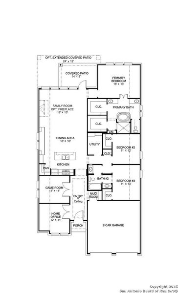 Entry framed by a home office and game room both with French door entry. Generous family room with a grand wall of windows. Kitchen features an island with built-in seating space, a 5-burner gas cooktop and a corner walk-in pantry. Secluded primary suite with three large windows. Primary bathroom features French door entry, dual vanities, garden tub, separate glass enclosed shower and dual walk-in closets. Secondary bedrooms with wall-in closets, a utility room and a Hollywood bathroom complete this design. Extended covered backyard patio and 5-zone sprinkler system. Mud room just off the two-car garage.