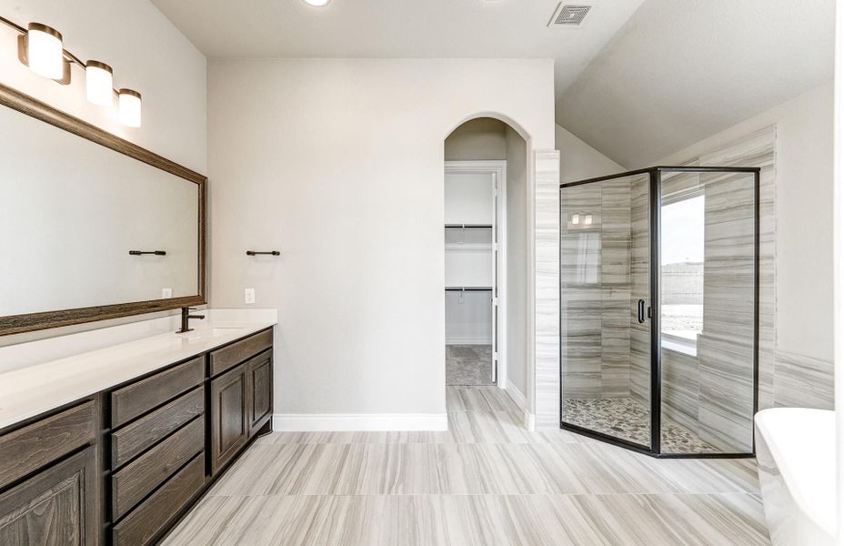 1½-story floor plan features an elegant oval entry with 13' ceilings that open to the formal living room. The extended entry with a 12' ceiling is flanked by formal dining room on one side and kitchen on the opposite side. The kitchen is central to the home and open to the dining room, breakfast room and family room. It features a large island and 42" cabinets. The family room features a 14' ceiling, fireplace, and large wall of windows. Master bath includes a freestanding tub, separate shower and His and Hers vanities. Located upstairs is a game room, theater room, and ½ bath. A covered patio overlooks the backyard. Home sits on a lot with no back neighbors and a waterfront view.