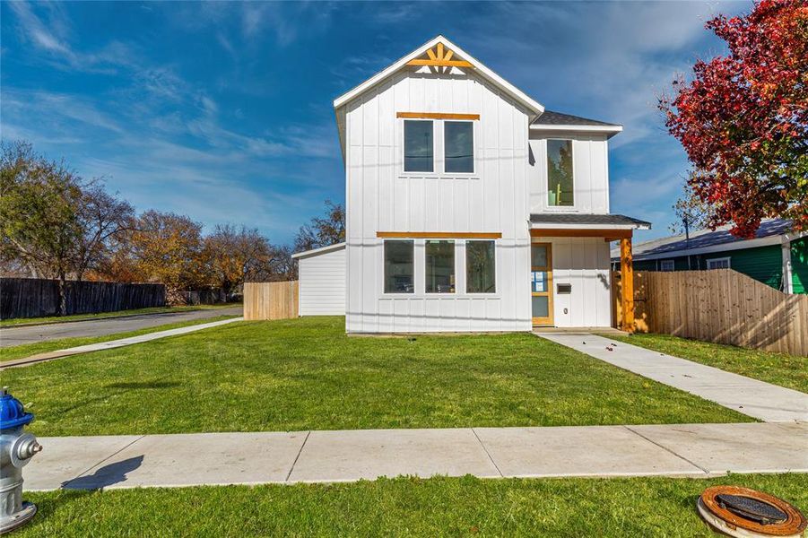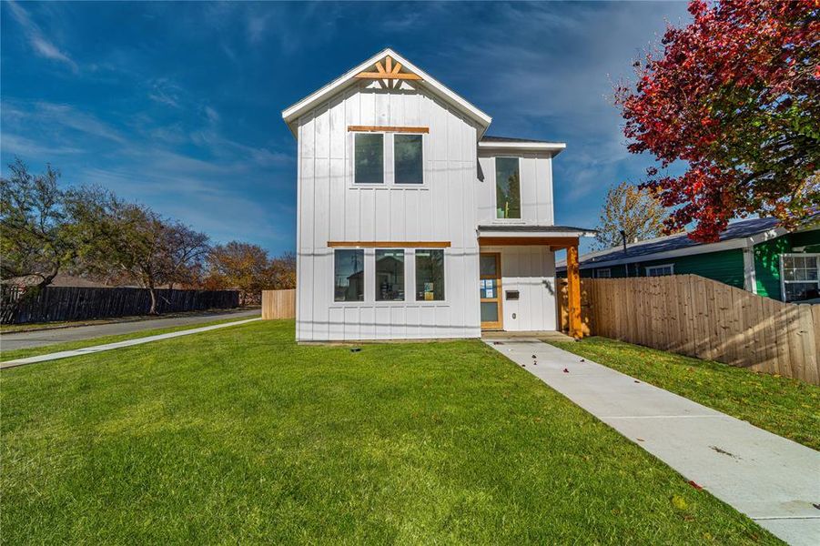 Modern new construction on a corner lot with striking architecture and high-end finishes throughout. Soaring 20 foot ceilings create an impressive open feel, complemented by mahogany wood stair rail accents and matching door trim that add warmth and character. The open-concept kitchen features an oversized island, custom cabinetry, and a pot filler, flowing seamlessly into the living and dining areas ideal for entertaining. The primary suite offers a spa-inspired bathroom with a European-style wet room showcasing a freestanding soaking tub inside an oversized walk-in shower. Bonus or secret room provides flexible space for an office, gym, or creative use. Automatic gated entry, private backyard, and sleek modern exterior complete this thoughtfully designed home just minutes from downtown Dallas