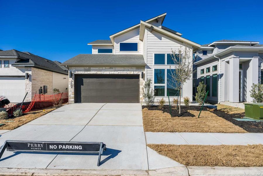 Enter through the side porch into a split entryway, where a private home office awaits behind French doors on one side, while the family room beckons with its impressive 19-foot ceiling on the other. The kitchen features an island with built-in seating, 5-burner gas cooktop and a corner walk-in pantry, seamlessly connecting to the adjacent dining area which boasts a wall of windows, offering ample natural light. Tucked away off the main living areas, the utility room adds convenience to daily tasks. The primary bedroom is a serene retreat, featuring a wall of windows for abundant natural light. French doors lead to the primary bathroom, complete with dual vanities, a glass-enclosed shower, and a spacious walk-in closet. Upstairs, discover a versatile game room with its own wall of windows. A private guest suite awaits, offering comfort and privacy with a full bathroom, walk-in closet, and linen closet. Additional secondary bedrooms, each with walk-in closets, share a well-appointed bathroom and offer attic access for storage convenience. Covered backyard patio. The two-car garage is accessible from the main entryway.
