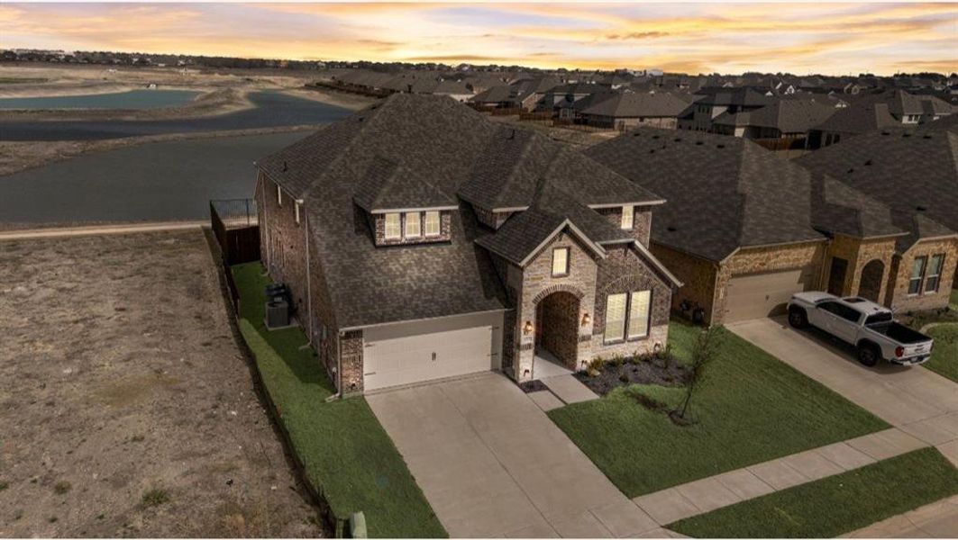 Situated on a premium lot with peaceful pond views and no rear neighbors, this property offers both privacy and a scenic backdrop. The exterior features full gutters, professional landscaping with an installed sprinkler system, and a fully fenced yard with wood and wrought-iron fencing.
