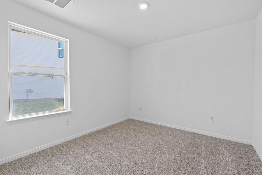 The private main bedroom suite, located just off the family room, features a generous walk-in closet and an en-suite bathroom. Additional highlights include a professionally designed landscape package with full irrigation and our Home Is Connected® base package—featuring smart-home devices such as a video doorbell, Deako® smart light switches, a Honeywell® thermostat, and more.