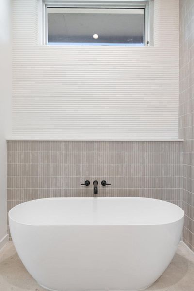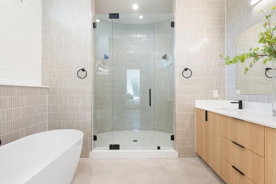 Interior features include floor-to-ceiling windows, standing seam metal roof, porcelain tile backsplashes, quartz countertops, Bosch stainless steel appliances, induction cooktop, and smart home features. The primary suite offers a dual vanity and freestanding soaking tub.