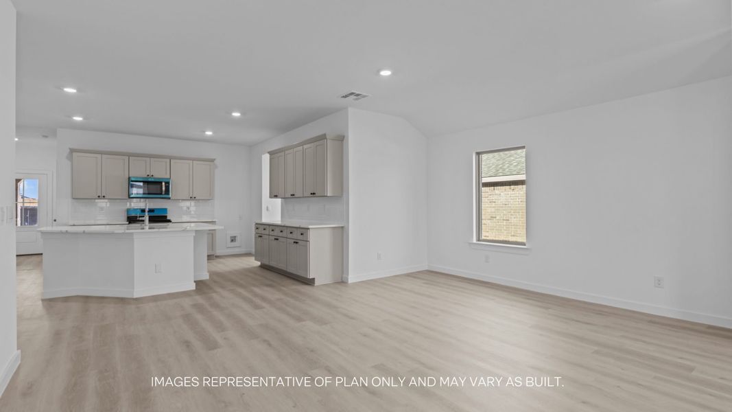 The Kingston plan is a fantastic one-story home offering comfortable and efficient living. This floorplan features 4 spacious bedrooms, 2 bathrooms, and a 2-car garage. -As you enter, you'll find the guest bedrooms and a convenient guest bathroom with a linen closet. The heart of the home is the center kitchen, which boasts an oversized breakfast bar with beautiful countertops and sleek stainless-steel appliances. This kitchen seamlessly flows into a large, combined family room and dining area, creating an open-concept space that's perfect for both everyday living and entertaining. The primary suite is a true retreat, complete with a sloped ceiling for added character and an attractive primary bath. You'll appreciate the dual vanities, a private water closet, and a generous walk-in closet. Step outside from the family room to enjoy the standard rear covered patio, an ideal spot for relaxing or hosting outdoor gatherings.-