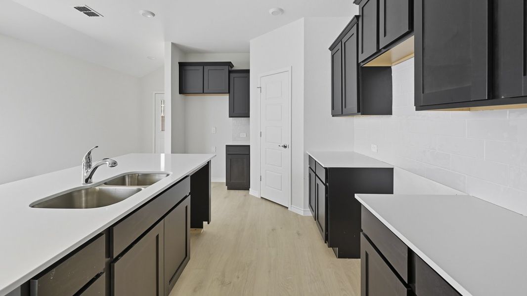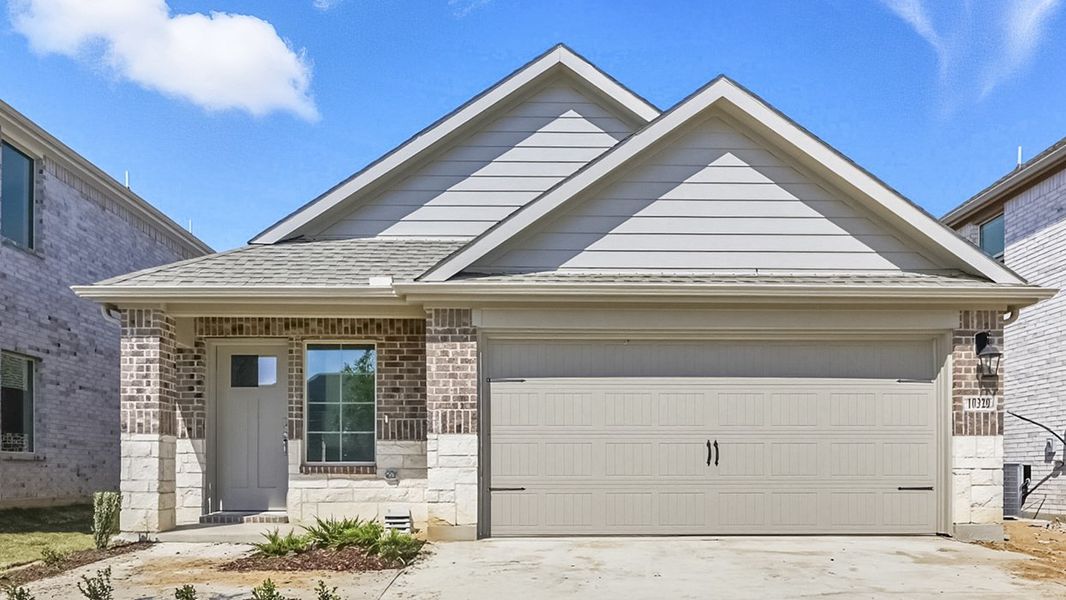 The Douglas floor plan in the community of Silverado Aubrey, TX offers a comfortable and efficient one story layout with three bedrooms and two bathrooms. offers full brick with beautiful stone elevations. A spacious covered front porch is a standout feature, providing a beautiful entry into an open concept living area that creates a seamless flow between the island kitchen, dining, and living spaces, perfect for family activities and entertaining. The well-equipped kitchen includes stainless steel gas range, microwave and dishwasher, ample counter space, and storage including a spacious corner pantry. The primary bedroom features an en-suite bathroom and walk-in closet. A covered patio provides a perfect space to relax outdoors. We are excited about our new energy options of spray foam attic insulation and 2x6 studs in the walls. This practical design combined with modern amenities creates a comfortable and welcoming home.