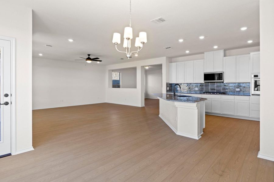 This stunning, two-story home showcases an open floor plan with luxury vinyl plank flooring, a spacious family room and Flex Space, which is perfect for entertaining. The kitchen boasts sleek flat-panel upper cabinets, granite countertops and a gas cooktop. Upstairs, a versatile loft expands the living space. Unwind in the primary suite, which features plush carpeting, two walk-in closets, a private study and connecting bath that offers a relaxing tub and luxurious separate walk-in shower. Additional highlights include a smart thermostat, Sherwin-Williams® interior paint, modern Moen® fixtures throughout and ceiling fans at family room and primary bedroom. Relax outdoors on the covered back patio.