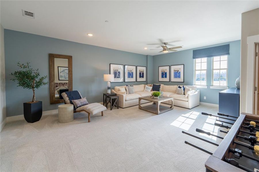 Luxury awaits in this stunning Builders Model Home, ideally situated on a corner lot within an active 55+ gated community. Offered fully furnished with all appliances, this residence provides a seamless, turn-key living experience. The home is loaded with high-end upgrades, including upgraded laminate flooring throughout the main living area. The gourmet kitchen is a chef's delight, boasting upgraded quartz countertops, an extended island with breakfast bar seating, a farmhouse sink, under-cabinet lighting, a 5-burner gas cooktop, a walk-in pantry, and a convenient butler's pantry. The adjacent extended living area, bathed in natural sunlight, features a cozy gas log fireplace and opens to a large covered patio. The private first-floor primary suite is a sanctuary with a tiered ceiling, his-and-her vanities, a walk-in shower, and a spacious walk-in closet. A second guest suite with an ensuite bath is also located on the main floor. A home office with elegant French doors provides a quiet workspace. The second floor offers a versatile third bedroom with a full bath and a large game room. Additional features include a mudroom with a built-in bench, a laundry room with built-in cabinets, ample storage throughout, and an oversized 2-car garage. Enjoy the ultimate lock-and-leave lifestyle, with the HOA taking care of all front and back yard maintenance. The community offers exceptional amenities, including a clubhouse, fitness center, pickleball courts, a pool, an outdoor grilling area, a fire pit, a wellness center, and walking trails. This is a great investment opportunity, builder will need a 3 year lease back, under great terms.