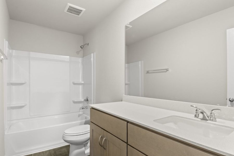 Enter 13513 Stocksbridge Drive in Pflugerville’s Edgebrooke community and be invited in by the warmth of the wood-look vinyl flooring through the open concept living areas and natural lighting radiating throughout. The unique layout offers a full bed and bath as well as the primary suite on the first floor, with a spacious game room, three bedrooms, and a full bathroom upstairs. Meals are made easier in an L-shaped kitchen featuring a corner pantry, 42-inch upper cabinets, durable 3cm granite countertops, a center island, and upgraded stainless steel appliances, including a sleek electric cooktop. The primary is your own oasis with a walk-in closet, separate water closet, dual vanity, and walk-in shower. Enjoy other highlights, including coordinating light brown cabinets throughout, raised bathroom vanities with Silestone countertops, 5-panel interior doors, and more!