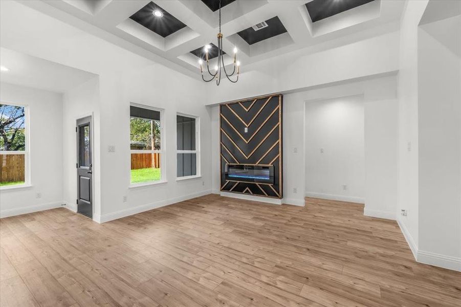Beautiful modern home with striking white stucco offering an open concept layout, decorative lighting, and elegant finishes throughout. The wide, welcoming entry hallway features stunning chandeliers that lead into a living area with a unique black waffle style ceiling and a stylish accent wall framing the fireplace. The kitchen includes white cabinets with glass panels and lighting, a walk in pantry, a beautiful island with black quartz countertops, a farm sink, and a built in microwave. The primary bedroom features a luxurious en suite bathroom with a modern floating black vanity with LED lighting, double sinks, a large contemporary shower with glass doors, two ceiling mounted rain heads, and an LED accented niche, along with a huge walk in closet. The primary bedroom also includes a beautiful black accent wall that adds a modern and elegant touch to the space.The secondary bedrooms share a beautiful bathroom with a floating black vanity with LED lighting and a tub shower combo with an LED accented niche. Additional upgrades include epoxy floors in the garage, entryway, and back porch. This home has been thoughtfully designed with premium, carefully selected finishes throughout.