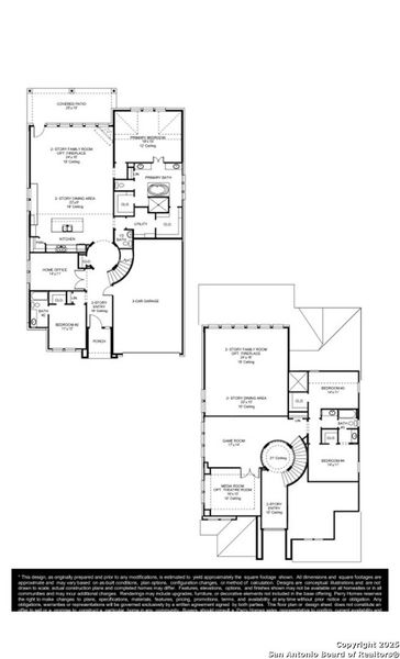 Two story entry with 19-foot ceilings. Home office with French doors just off the foyer with an adjacent circular staircase. Two story family room with a wood mantel fireplace and grand wall of windows extends to the dining area. Island kitchen with built-in seating space, two wall ovens, a 5-burner gas cooktop and a corner walk-in pantry. Secluded primary suite features bedroom with 12-foot ceilings, double door entry to primary bathroom, dual vanities, freestanding tub, separate glass enclosed shower, two walk-in closets and additional private entry to the utility room. Guest suite with full bathroom and a walk-in closet on first floor. Second floor hosts a generous game room that overlooks the family room and dining area, media room, a Hollywood bathroom and secondary bedrooms. Covered backyard patio. Three-car garage.