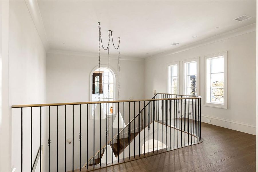 Welcome to The Preserve in Frisco, one of the nation’s most sought-after gated communities, set among rolling hills and anchored by two PGA championship golf courses. This exceptional custom home by Coats Homes showcases refined transitional design with the rare advantage of immediate move-in—offering elevated living without the wait. Santa Barbara-inspired architecture by Jerry Coleman pairs seamlessly with sophisticated interiors by Park Interiors, delivering remarkable craftsmanship, curated finishes, and premier amenities just moments from nature trails, dining, shopping, and world-class golf. Spanning 5,915 square feet, the home offers 5 bedrooms, 5 full baths, and 2 half baths, along with a game room, dedicated gym or media room, study, and an oversized three-car garage—all wrapped in an authentic barrel clay tile roof. A grand two-story entry makes an immediate impression, welcoming guests through steel doors onto limestone floors, where a fireplace and sweeping spiral staircase create a dramatic sense of arrival. Floor-to-ceiling windows flood the home with natural light, highlighting wide-plank oak hardwood floors, beautiful millwork, and smooth-finished walls. The chef’s kitchen is a true showpiece, appointed with Wolf & Sub-Zero appliances and an exceptional working pantry designed for both functionality and entertaining. The family room is anchored by a striking see-through fireplace and flows seamlessly into the kitchen and dining areas, while the study-lounge features thoughtful built-ins for a refined, functional retreat. The first-floor primary suite offers privacy and comfort, complemented by two laundry rooms—one on each level. Upstairs, four en-suite bedrooms with walk-in closets provide separation and flexibility, along with a spacious game room and dedicated gym or media room. Designed for year-round enjoyment, the outdoor living spaces connect effortlessly through LaCantina sliding doors and feature a fireplace and in-ceiling heaters.