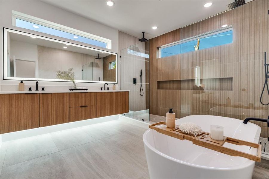 Modern Luxury Living with Rooftop & Unforgettable Dallas Skyline Views. Elevated urban living in this brand-new modern SFA home perfectly positioned along the scenic Santa Fe Trail—offering nearly 90 miles of biking, hiking & jogging right outside your door. Just minutes from White Rock Lake, Lower Greenville entertainment, Lakewood Shopping & Downtown, this home blends sophisticated design with everyday comfort. Soaring ceilings, floor-to-ceiling windows & a long waterfall quartz island define the open-concept living area. Designer details shine throughout—custom soft-close cabinetry with Blum European hinges, West Elm fixtures, smart LED lighting you can control from your phone, & a color-changing electric fireplace that sets the perfect mood. The spa-inspired primary suite feels like a five-star retreat with dual walk-in closets, fireplace, freestanding tub, dual shower heads, floating vanities, LED mirrors & imported tiles. Outdoors, enjoy a covered patio, private fenced yard & an amazing 400 SF rooftop terrace with water, power & panoramic Downtown views. Energy-efficient foam insulation, tankless water heater, casement windows, Energy Star appliances & EV hookup ensure comfort & savings year-round. Oversized 23ft garage fits a truck or could be home gym. Private gated entrance & full builder’s warranty included. Premier trail-side unit—no neighbor, extra light & endless views.