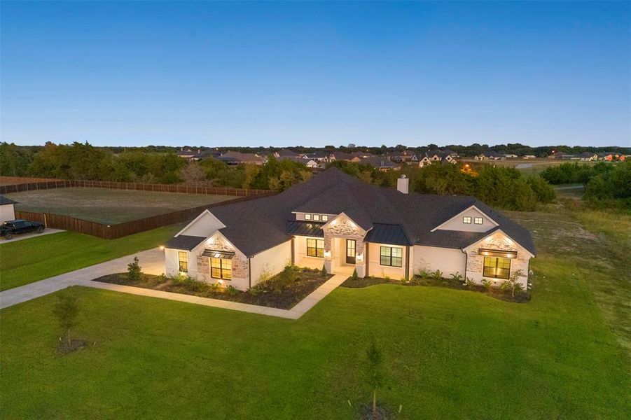 Located in the desirable Tuscan Estates community, this custom luxury home offers exceptional design, energy efficiency, and high-end finishes throughout. Situated on a spacious 2.5-acre homesite, the property provides privacy while remaining close to Lake Waxahachie, Downtown Waxahachie, and I-35. This four-bedroom, three-bathroom home with a media room and office offers a blend of luxury, comfort, and functionality in one of Waxahachie’s premier neighborhoods. Interior Features include open-concept layout with high ceilings and custom cabinetry throughout, office with built-in library, media room with built in wine refrigerator, the spacious custom kitchen includes Thermador appliance package with a 48 inch range, three ovens and a 6 inch built-in refrigerator, gas tankless water heater, safe room for additional security. Exterior & Mechanical Features: Buried propane tank, indoor and outdoor fireplaces, energy-efficient construction and materials. $20,000 buyer incentive available.