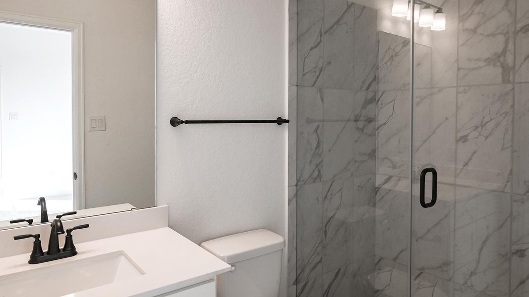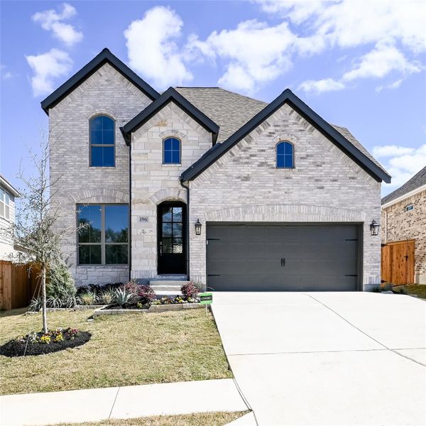 Home office with French doors set at two-story entry. Two-story family room opens to kitchen and morning area. Kitchen features large walk-in pantry, a 5-burner gas cooktop, and generous island with built-in seating space. Family room features wall of windows. First-floor primary suite includes bedroom with wall of windows. Dual sinks, garden tub, separate glass-enclosed shower and large walk-in closet in primary bath. Game room and all secondary bedrooms are upstairs. Extended covered backyard patio. Two-car garage. Stone wall privacy fence in back yard. Catch and release fishing pond within community.
