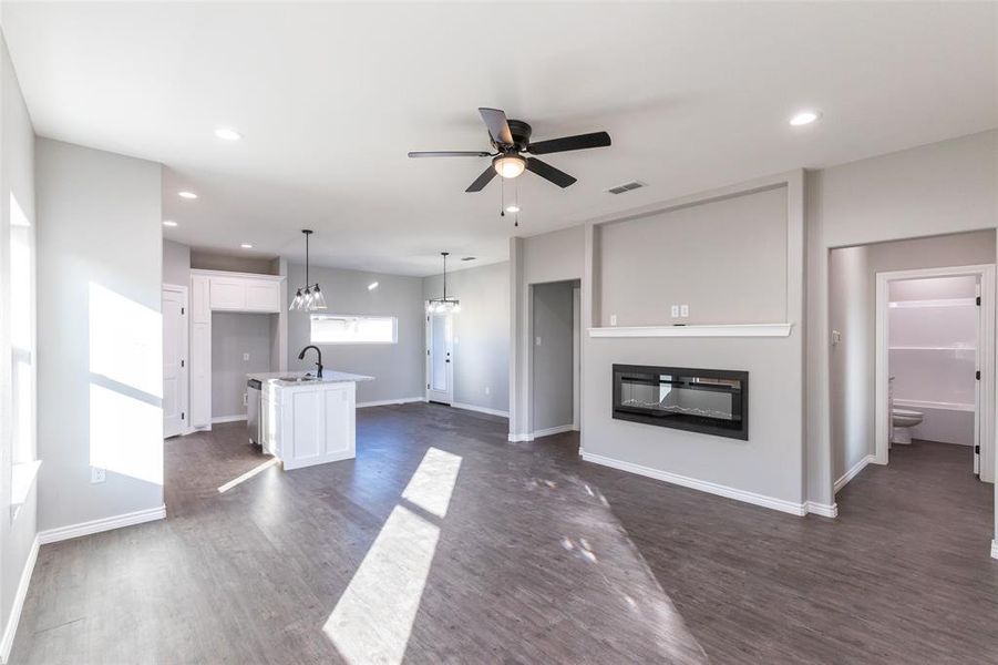 Welcome to this stunning New Construction Home by TamRon Construction, featuring an open concept design with a fireplace in the living room and modern finishes throughout. This 3-bedroom, 2-bathroom residence boasts durable vinyl plank flooring in every room, offering both style and easy maintenance. The spacious kitchen is complete with stainless steel appliances, granite countertops, a convenient corner pantry, and an island perfect for entertaining. The split bedroom floor plan provides privacy, with the primary suite featuring an electric fireplace and in the bathroom, dual sinks, granite counters, a generous walk-in closet. Additional highlights include a laundry room located just off the 2-car garage, beautifully landscaped front and backyards, and a fully fenced backyard offering both privacy and space for outdoor enjoyment. Don’t miss this opportunity to own a move-in-ready home with quality finishes and thoughtful design. Schedule your tour today!