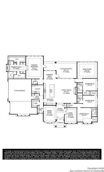 Double front doors open into a grand entryway that is embraced by a formal dining room which boasts a curved wall of windows and a private home office with French doors. The large family room boasts a warming wood mantel fireplace and a sliding glass door. The connecting kitchen features an island with built-in seating, large walk-in pantry, a double wall oven, and a butler's pantry leading to the dining room. The morning area provides ample natural light and offers access to the backyard covered patio. The primary bedroom boasts an extended tray ceiling and wall of windows. Double doors lead into the bathroom which highlights a garden tub, dual vanities, a glass enclosed shower, and two walk-in closets. The three secondary bedrooms each feature a walk-in closet and private bathroom. The game room offers an additional space for entertainment. The mud room is off the three-car garage.