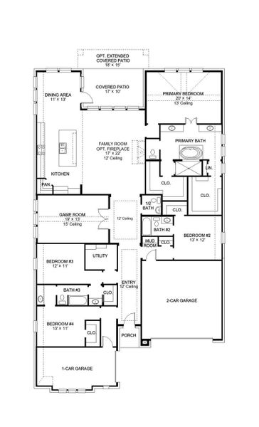 Entry and extended entry with 12-foot ceiling. Large game room with French door entry. Island kitchen with a walk-in pantry flows into the dining area. Spacious family room with a wall of windows. Secluded primary suite with a wall of windows. Dual vanities, center garden tub, separate glass enclosed shower, a linen closet and two large walk-in closets in the primary bath. Guest suite and secondary bedrooms joined by a Hollywood bathroom complete this spacious design. Covered backyard patio. Three-car split garage.