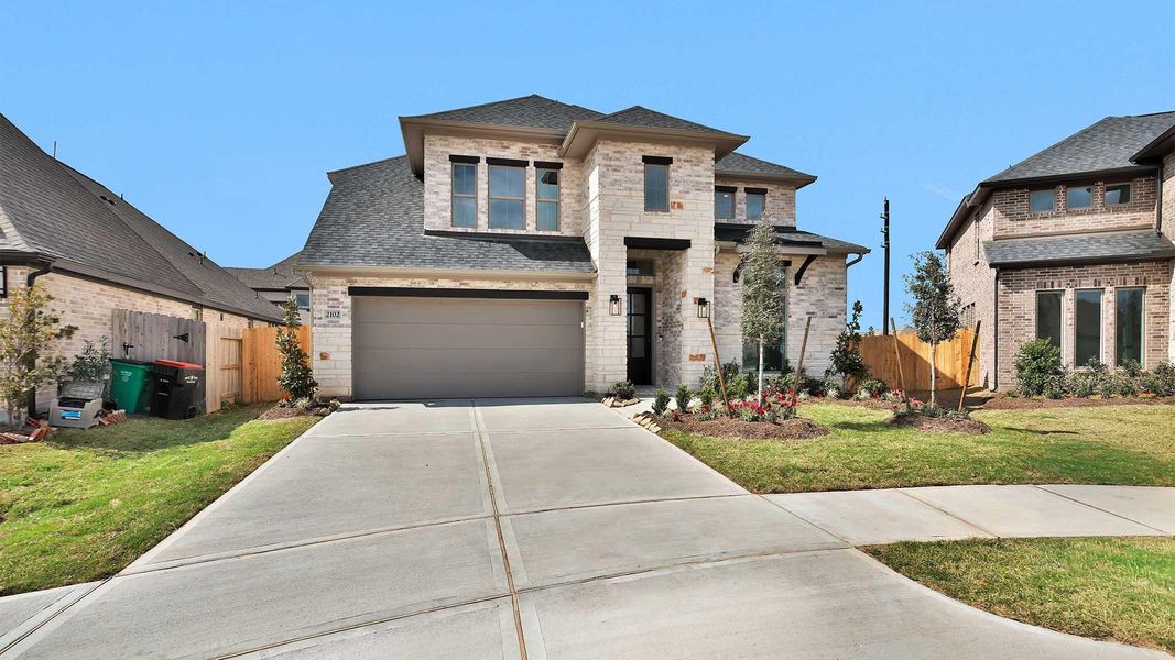 MOVE IN READY! Home office with French doors and 11-foot ceiling set at two-story entry. Open kitchen features deep walk-in pantry and generous island with built-in seating space. Dining area opens to two-story family room with wall of windows. Primary suite includes bedroom with 10-foot tray ceiling. Double doors lead to primary bath with dual vanity, garden tub, separate glass-enclosed shower and large walk-in closet. An additional bedroom is downstairs. Secondary bedrooms and game room with 10-foot tray ceiling are upstairs. Covered backyard patio. Mud room off two-car garage.