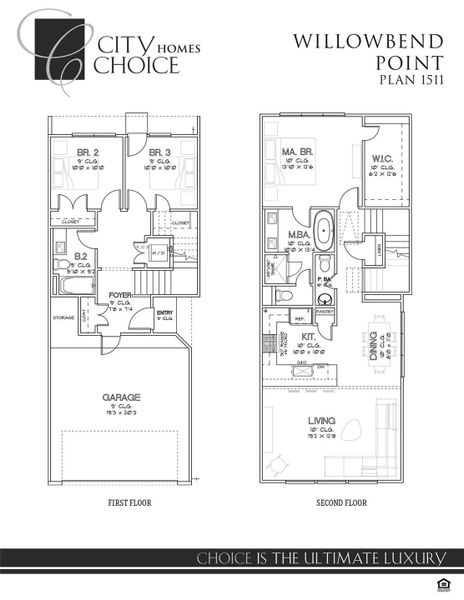 Three-bedroom, 2.5 bath, 1511 sq.ft. home in Willowbend Point. First floor offers two secondary bedrooms, full bath, utility area, storage, and attached two-car garage. Second floor features open-concept living and dining with centrally located kitchen, pantry, powder bath, and private primary suite with walk-in closet and ensuite bath. Efficient layout and ample storage throughout.