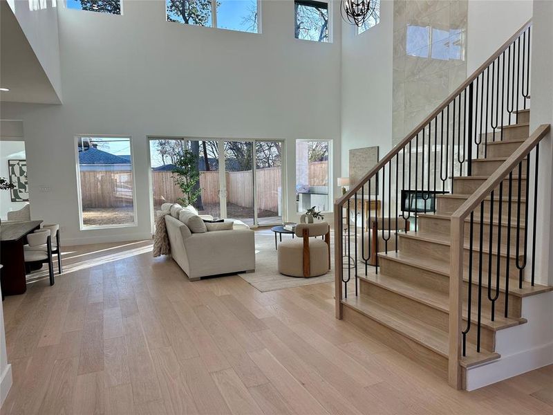 Step inside to a dramatic two-story layout where natural light pours into the nearly 500 sq. ft. family room, highlighted by a breathtaking 21-foot ceiling. The chef’s kitchen is the true centerpiece of the home, featuring an impressive Taj Mahal Plus quartz island, white shaker cabinetry, a 48-inch Wolf gas range, full-size Sub-Zero refrigeration, and wide-plank white oak floors that carry throughout the home for a seamless, elevated feel.