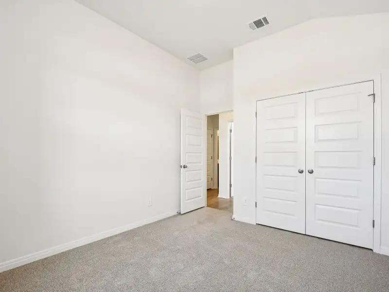 The primary suite features dual sinks and a generous walk-in closet. Gray cabinets with marble-look white quartz countertops, warm beige EVP flooring, and multi-tone taupe carpet in our Radiant package.