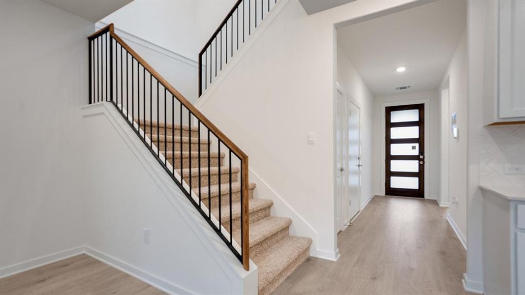 This plan includes a secondary bedroom and full bathroom downstairs at the front of the home. As you walk through the long foyer to the open layout of the home you will find the large kitchen is open to the spacious family room and dining area. The kitchen features granite or quartz countertops, decorative tile backsplash, stainless steel appliances and a large kitchen island. The main bedroom, bedroom 1, is located downstairs and features a large walk-in shower and huge walk-in closet. Upstairs you will find a large game room along with the three other bedrooms and another full bathroom.