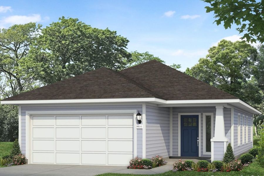 This spacious home features 1,450 square feet of thoughtfully designed space, accommodating 3 bedrooms and 2 full bathrooms. Step into an inviting interior that boasts an open floor plan, seamlessly connecting the living and dining areas, ideal for both entertaining and everyday living. The well-appointed kitchen includes essential features such as a pantry, 42-inch cabinet uppers, and a center island, ensuring functionality and convenience. The primary suite includes a dual vanity, walk-in closet, semi-private water closet, and walk-in shower. A mud room provides access to the garage and utility room. Automatic sprinklers in the front, back, and side yards facilitate easy maintenance of the lush surroundings.