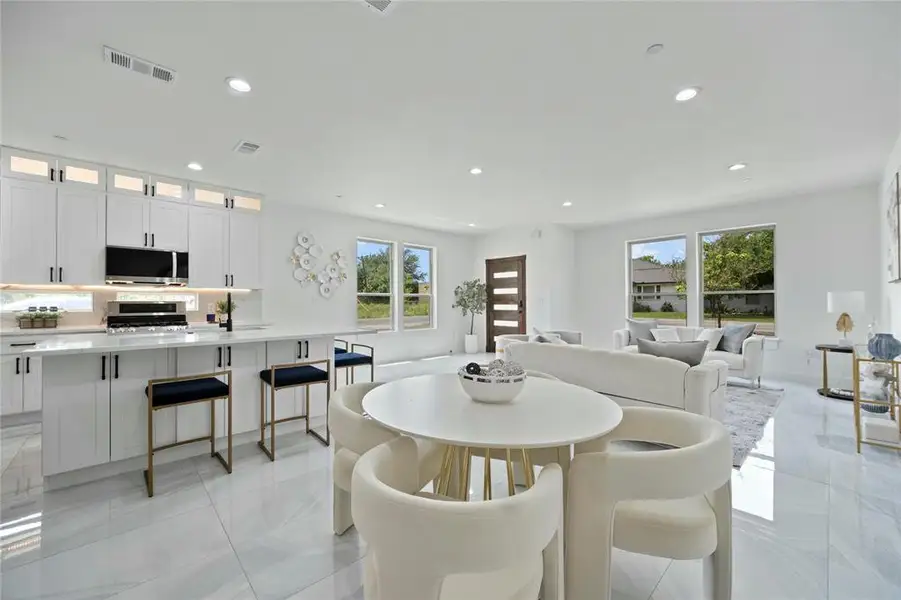 The main floor offers an open-concept layout with high ceilings and great natural light. At the center is a spacious kitchen with quartz countertops, stainless steel appliances, a large island, and plenty of storage — perfect for daily living or casual entertaining. The connected great room creates a welcoming space to relax or gather with friends and family.