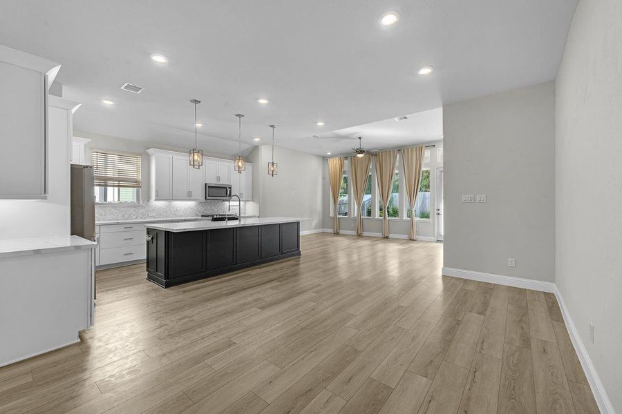 Built in 2023, this beautifully crafted 3-bedroom, 2-bath townhouse offers modern design, quality finishes, and a functional open layout. The main living area features luxury plank flooring, recessed lighting, and abundant natural light, creating a bright and inviting atmosphere. The contemporary kitchen boasts quartz countertops, a large island with seating, stainless steel appliances, custom cabinetry, and pendant lighting, flowing seamlessly into the living and dining areas—perfect for entertaining. The primary suite includes a spa-inspired ensuite bath with dual vanities and a tiled walk-in shower. Two additional bedrooms provide flexibility for guests, office space, or everyday living. Enjoy attractive curb appeal, a welcoming entry, and a two-car garage. Schedule your tour today!