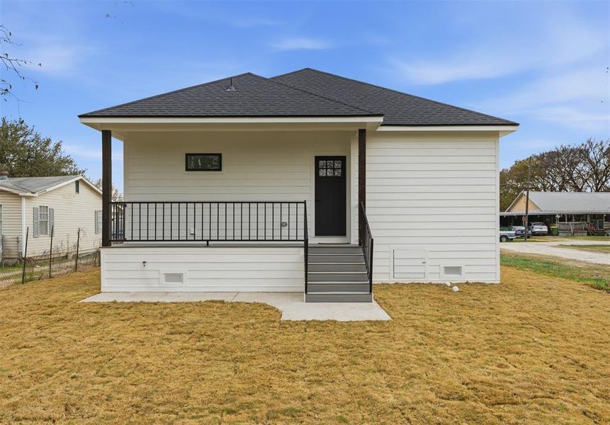 Welcome to this beautiful new construction 3-bedroom, 2-bathroom home offering 1,489 sq ft of living space, perfectly situated on a corner lot and conveniently located near grocery stores and fast-food options. Enjoy freshly sodded grass, a newly poured driveway, and a welcoming covered front porch with sleek black railing. Inside, you’ll find vinyl wood flooring throughout and recessed lighting in the open living areas, creating a bright and modern feel. The kitchen features quartz countertops, a crisp white backsplash, custom wood cabinetry, and a spacious island with barstool seating and additional storage, plus stainless steel range, microwave, and dishwasher that convey. The primary suite offers a spacious walk-in closet and a stylish bathroom with quartz countertops, ample storage, and a marble tub shower combo. Guest bedrooms are served by a secondary bathroom with quartz countertops, a marble tub shower combo and a large mirror. Toward the back of the home, you’ll find a dedicated laundry room with shelving, while the hallway includes a built-in work desk with a quartz countertop—perfect for a home office or study space. Step outside to the backyard and relax on the covered patio with black railing. Foam insulation adds energy efficiency, making this home as practical as it is stunning—don’t miss this move-in-ready gem!
