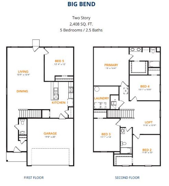 The Big Bend Plan from our Freedom Series offers 5 bedrooms, 2.5 bathrooms, and 2,408 square feet of thoughtfully designed living space in a versatile 2-story layout. As you step inside, you’ll pass the convenient half bathroom and staircase to the upper level before entering the open-concept living area. This space includes a well-appointed kitchen with a central island, a dining area, and a spacious family room perfect for family time or entertaining. Tucked off the family room, a flexible bedroom can serve as a guest room, office, or playroom to suit your family’s needs. Upstairs, you’ll find the expansive primary suite featuring a walk-in closet and private bathroom, offering a tranquil retreat. The upper level also includes three secondary bedrooms, a full bathroom, a generous loft for additional living space, and a conveniently located laundry room.