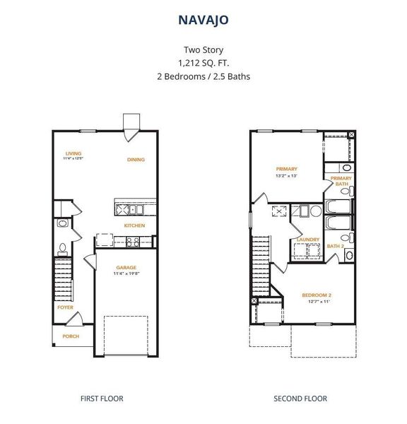 MLS# 55057781 - Built by NHC - Apr 2026 completion! ~ The Navajo Plan from our Celebration Series offers a thoughtfully designed two-story layout that blends open main-level living with private bedroom suites upstairs. With 2 bedrooms, 2.5 bathrooms, and 1,212 square feet of well-planned space, this home is ideal for buyers seeking comfort, efficiency, and modern design. The main level welcomes you with a covered front porch and foyer, leading into a hallway that opens to the kitchen, dining, and family room. The kitchen features an island with breakfast bar seating and generous counter space, opening to the dining and family room for easy everyday living. A patio door off the dining and living space provides access to outdoor enjoyment, while a convenient half bath completes the main level. The primary suite offers a private retreat with a walk-in closet and a dedicated full bath.