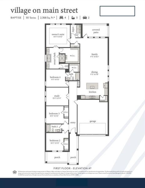 NORMANDY HOMES BAPTISE floor plan. Situated on a south facing lot, this charming front porch welcomes you inside a spacious one-story home with four bedrooms, three bathrooms and a study. All bedrooms offer generously sized walk-in closets. The well-designed open concept main living area seamlessly flows from one room to the next and makes entertaining a breeze. Tucked away, the owner's suite is private and relaxing with a spa-like ensuite featuring two vanities, an oversized shower and soaking tub. The owners closet on this home is to die for!