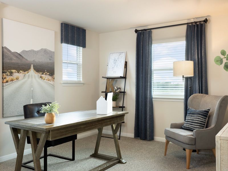 The expansive upstairs loft is perfect for hosting game nights. Retreat to the downstairs primary suite when you need quiet space. Linen cabinets with smoky grey granite countertops, grey-brown EVP flooring and textured carpet in our Cool package.