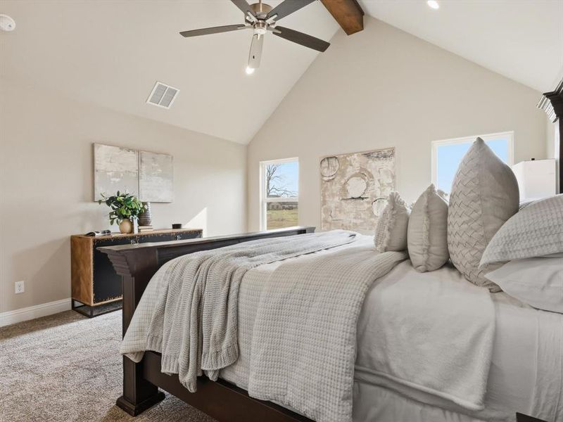 The living room sets the tone with wood beams, a stunning floor to ceiling stone fireplace, and impressive double sliding doors that open to the covered patio, creating the perfect indoor to outdoor flow. The kitchen is a showpiece with leathered granite counters, crisp white cabinetry, and a warm wood accent island that brings the entire space together. The walk-in pantry offers shelving and space for storage.